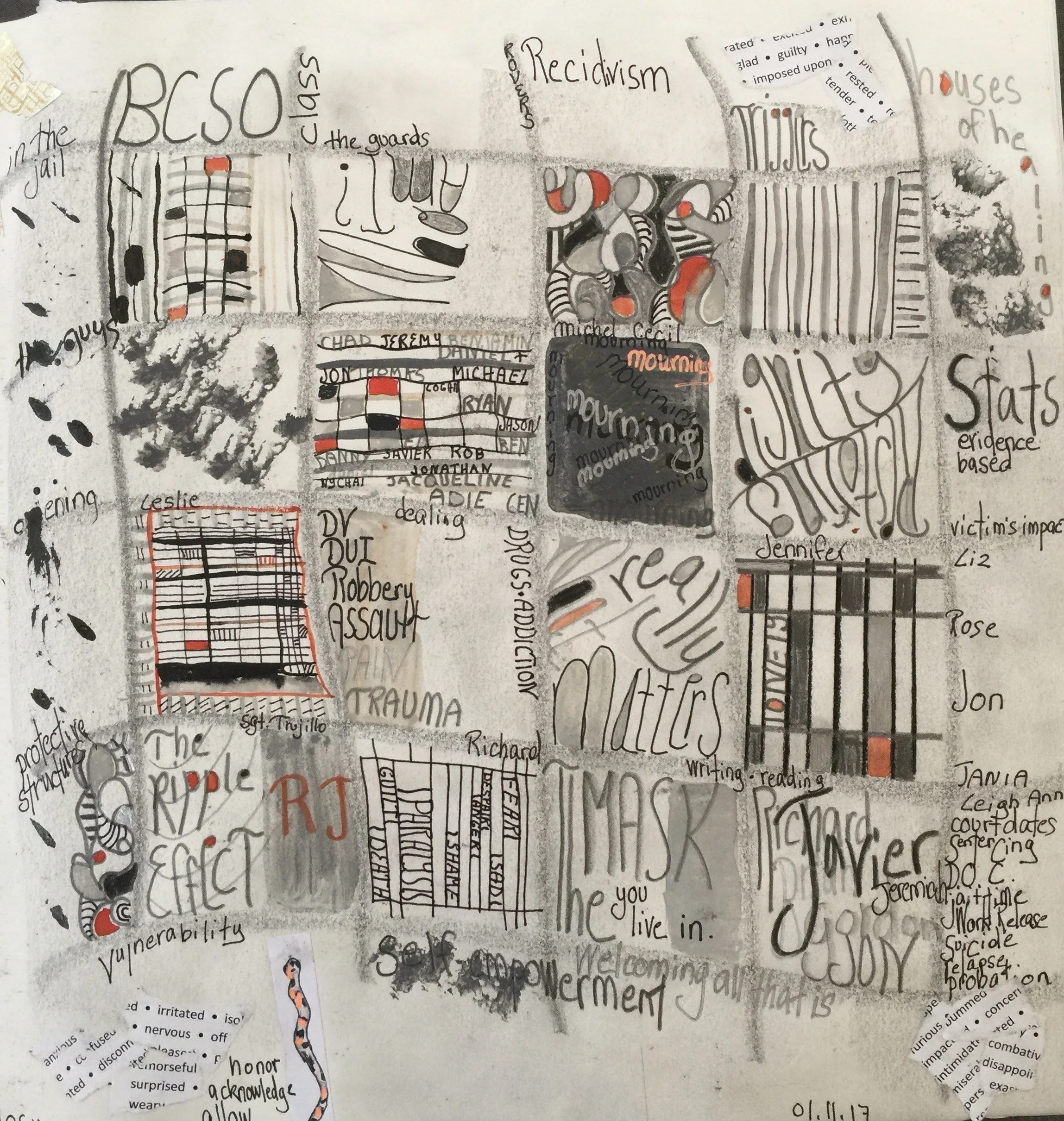 I remember Laurie sharing Paul Klee's quote "Not a Day without a Line" and I have tried to live into this motto. I walk down a stone pathway to my studio at the outer edge of my garden. I enjoy this transition leaving behind phone calls, computer, house duties, work, and engaging with seasonal vegetation and wildlife before entering what I consider to be my sanctuary. Papers, pencils, pens, ink, brushes, improvised writing tools, watercolors, and gouaches call me at different times. Whether twenty minutes or two hours spent in my studio, I find such depth and peace of mind as I fadoodle and fadaddle away (as I describe it) at my table. Music accompanies me. I may begin by writing or moving to rhythms. Slowing down, listening to my breathing, I settle into what is alive in me in the moment. I then put pencil to paper and begin writing, drawing, coloring and maybe even