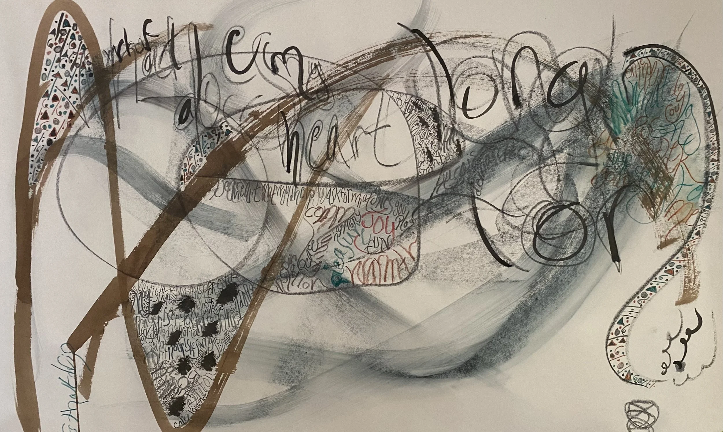 I dive into the inspiration of the day as I experience it and see what happens. I never quite know what will come forth, I make messes, try different materials, have occasional insights and trust the inner movement that wants to express itself. I treasure the stillness of not knowing, the inward listening and guidance, the deeper sense of timelessness and inner connection that can happen; an inner journey that supports me in processing and expressing the aliveness of being. And then there are those days when I wonder what the hell am I doing and will take a big brush and sumi ink to my paper and see what happens then.