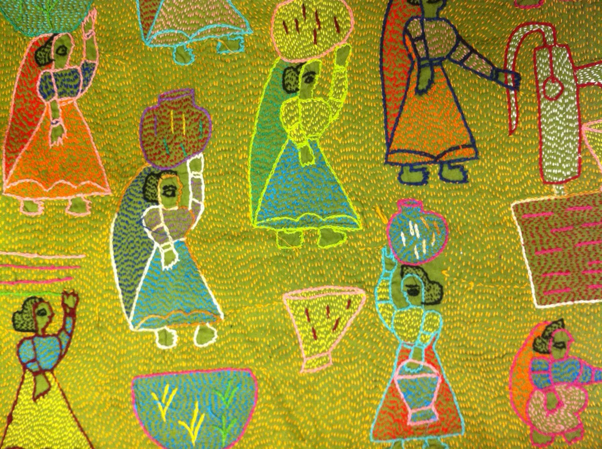 How did my dream know what I did not? How do I drum this dream, shepherd this vest into the daytime, to help with my writing? So I have set about making this vest with edges like feathers that catch sound. I took a handmade vest I have hanging in my closet. Each day I take red embroidery thread and make small Kantha stitches along the front for feathery softness. I am writing the dream on the satin lining on the inside of the vest. I have small Tibetan bells and telephone wire for receiving sound that I will stitch along the edges. This is dream drumming. There is tangible magic when this door between the worlds opens.