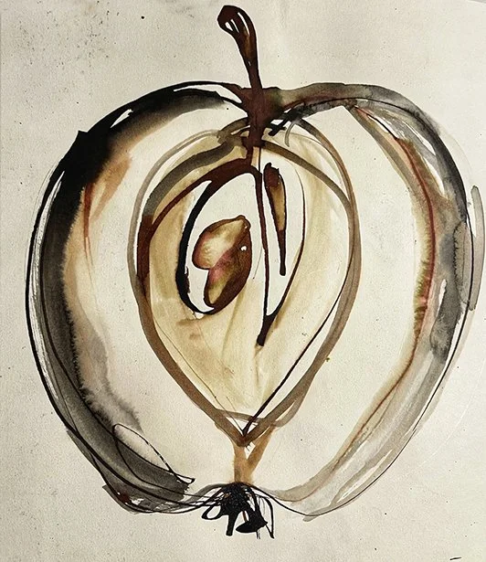 Spontaneous apple drawn with mussel shell, sumi & walnut ink